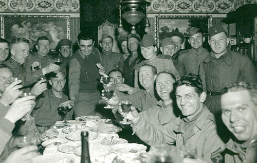 A celebration broke out when eastward-moving US First Army units and westbound Soviet troops met at the Elbe River in late April 1945, sealing Nazi Germany’s fate. Here, GIs trade toasts with Soviet troops. (National Archives)