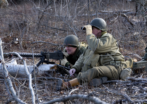 Even as the lines crumbled in the face of the German attack, scattered groups of GIs offered resistance to the enemy juggernaut. Here a machine-gun team prepares to meet the enemy. One soldier has settled in behind a .30-caliber Browning Automatic Rifle while his partner uses a monocular to spot the oncoming enemy.
