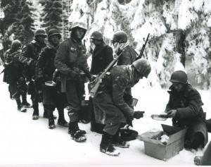 An M1 carbine hangs from the shoulder of a soldier of the 347th Infantry Regiment as he stoops at the front of a chow line to get a meal en route to La Roche, Belgium, in January 1945. (National Archives)